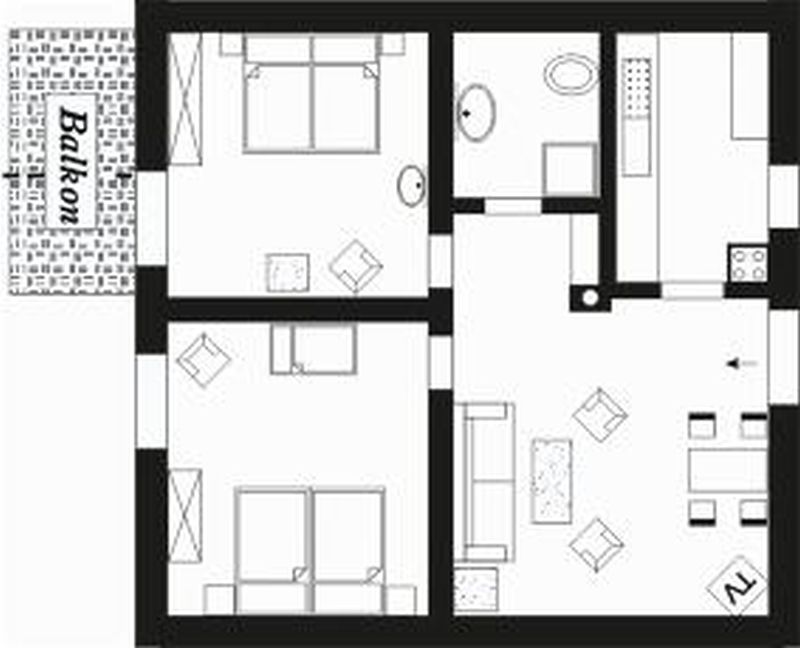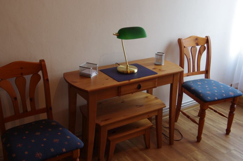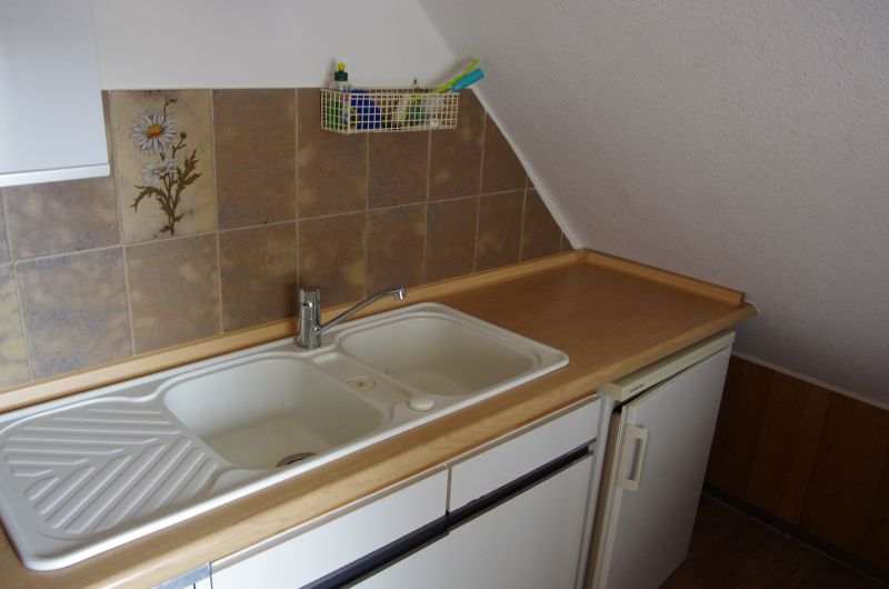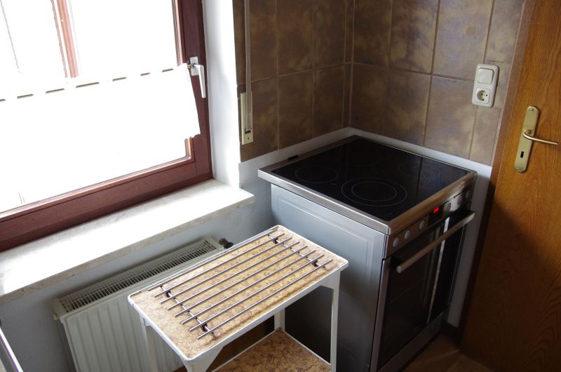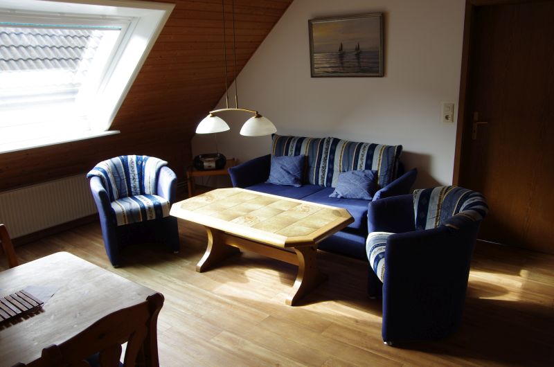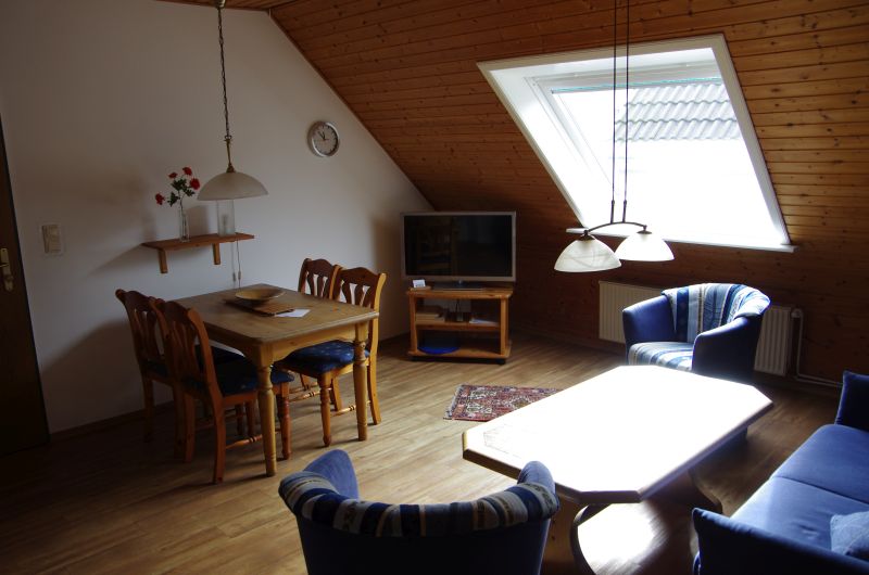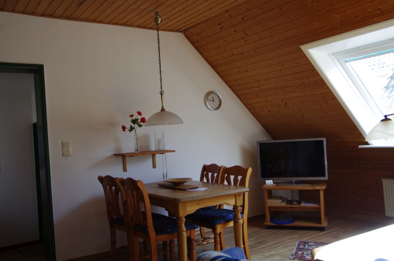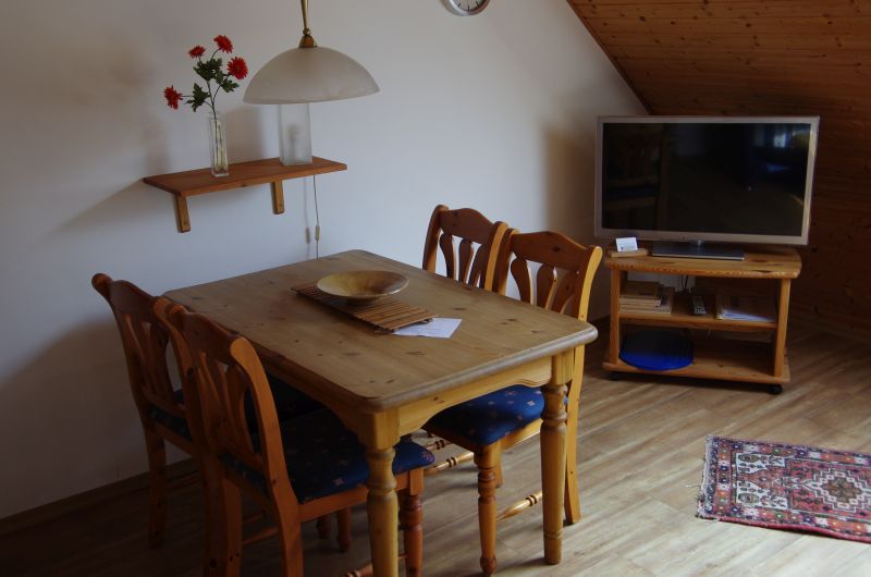 Die im Obergeschoß gelegene Ferienwohnung ist gemütlich und liebevoll eingerichtet. Der Fußboden ist durchgehend mit Vinyl ausgestattet. Der kombinierte Wohn- und Essraum lädt zum Speisen und gemütlichen Zusammensein ein. Die beiden Schlafzimmer sind hell und freundlich. In einem Schlafzimmer befindet sich ein Doppelbett und in dem anderen zwei Einzelbetten, welche jedoch zu einem Doppelbett zusammengeschoben sind. Für die Verdunkelung in beiden Zimmern sorgen die Außenrollläden an den Fenstern. Das Bad ist mit einer Dusche ausgestattet. In der separaten Küche finden Sie alles, was zum Kochen benötigt wird. Der Balkon lädt im Sommer zum Verweilen ein. Ein PKW-Stellplatz ist auf dem Grundstück vorhanden. Fahrräder können überdacht hinter dem Haus abgestellt werden.Wohnbereich